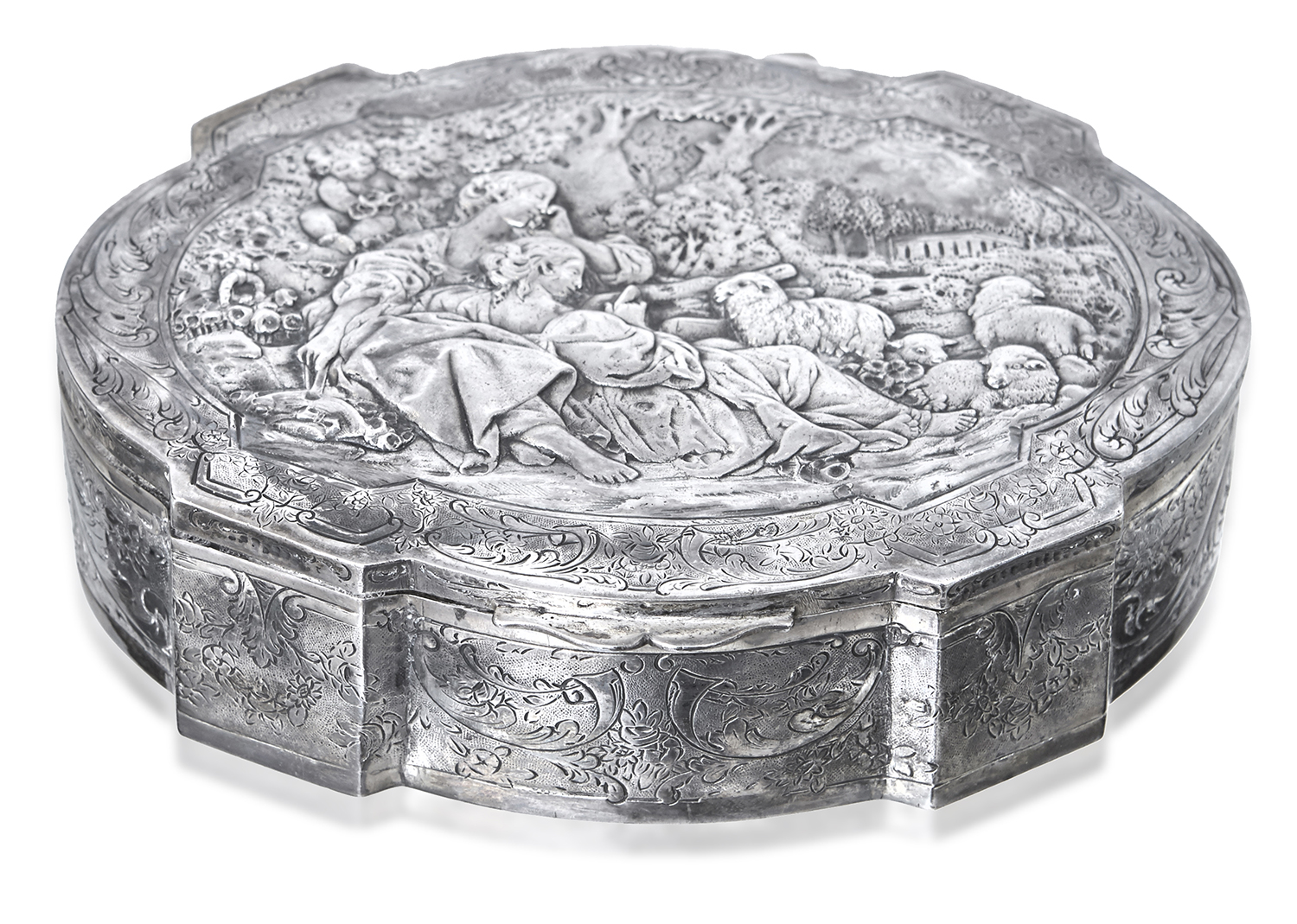 Of shaped oval form engraved with feather and floral swags, the cover embossed with Watteau scene, lined with blue velvet, marked 800, 17.5cm width, total weight 503 grams
