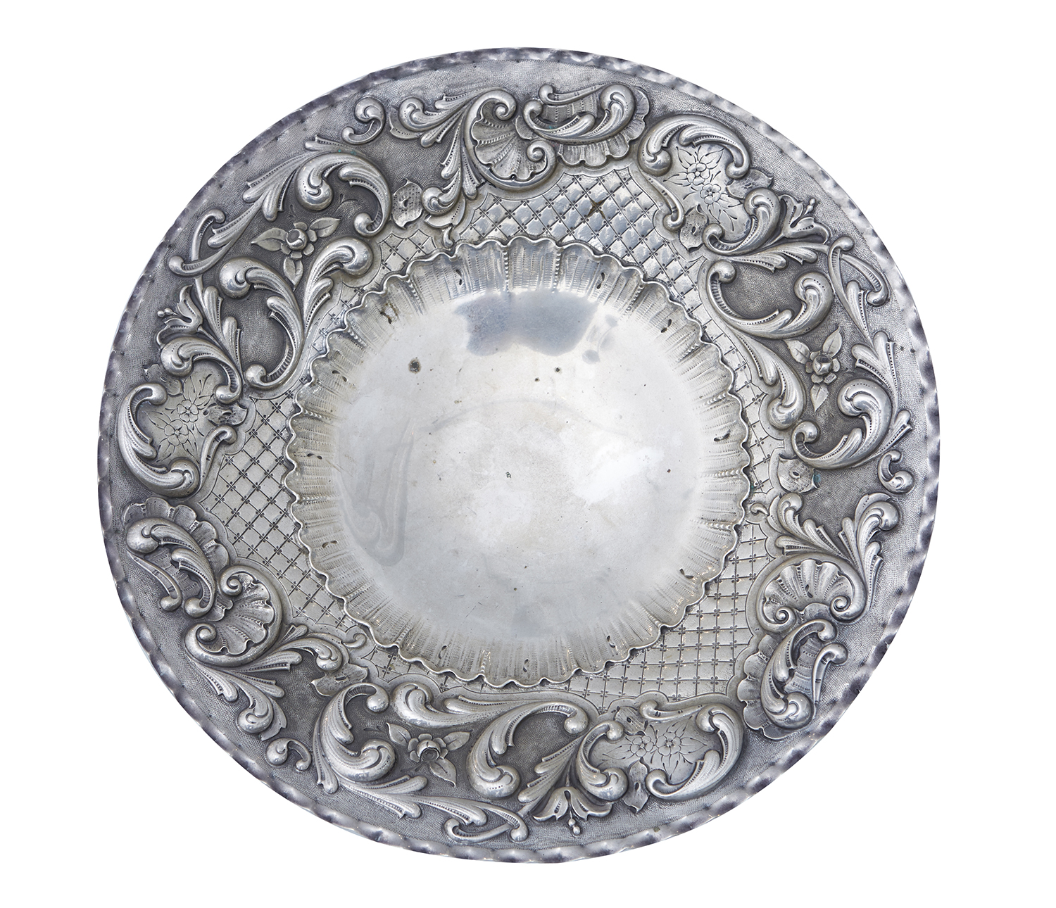 With pinched rim, embossed with feathered scrolls and bright cut trellis on a stippled ground, stamped 800, 32cm diameter, 694 grams