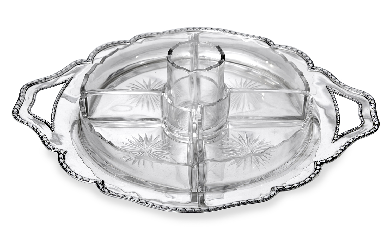 A CONTINENTAL SILVER TRAY WITH FITTED CUT CRYSTAL SECTIONAL DISHES