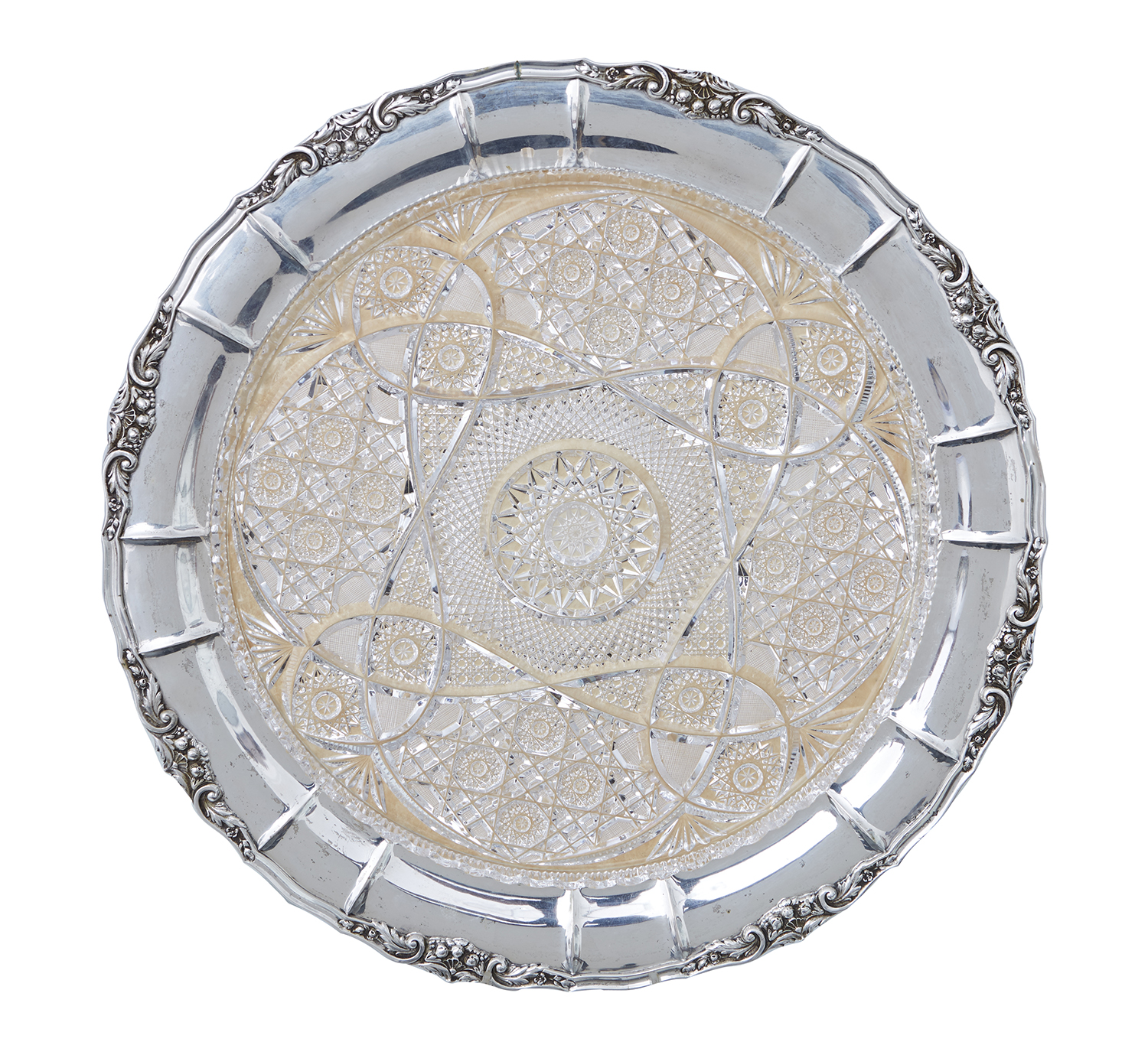 A CONTINENTAL 800 SILVER TRAY WITH FITTED CUT CRYSTAL DISH