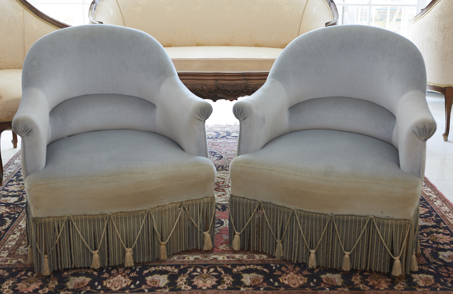 A PAIR OF FRINGE UPHOLSTERED TUB CHAIRS, CIRCA 1930
