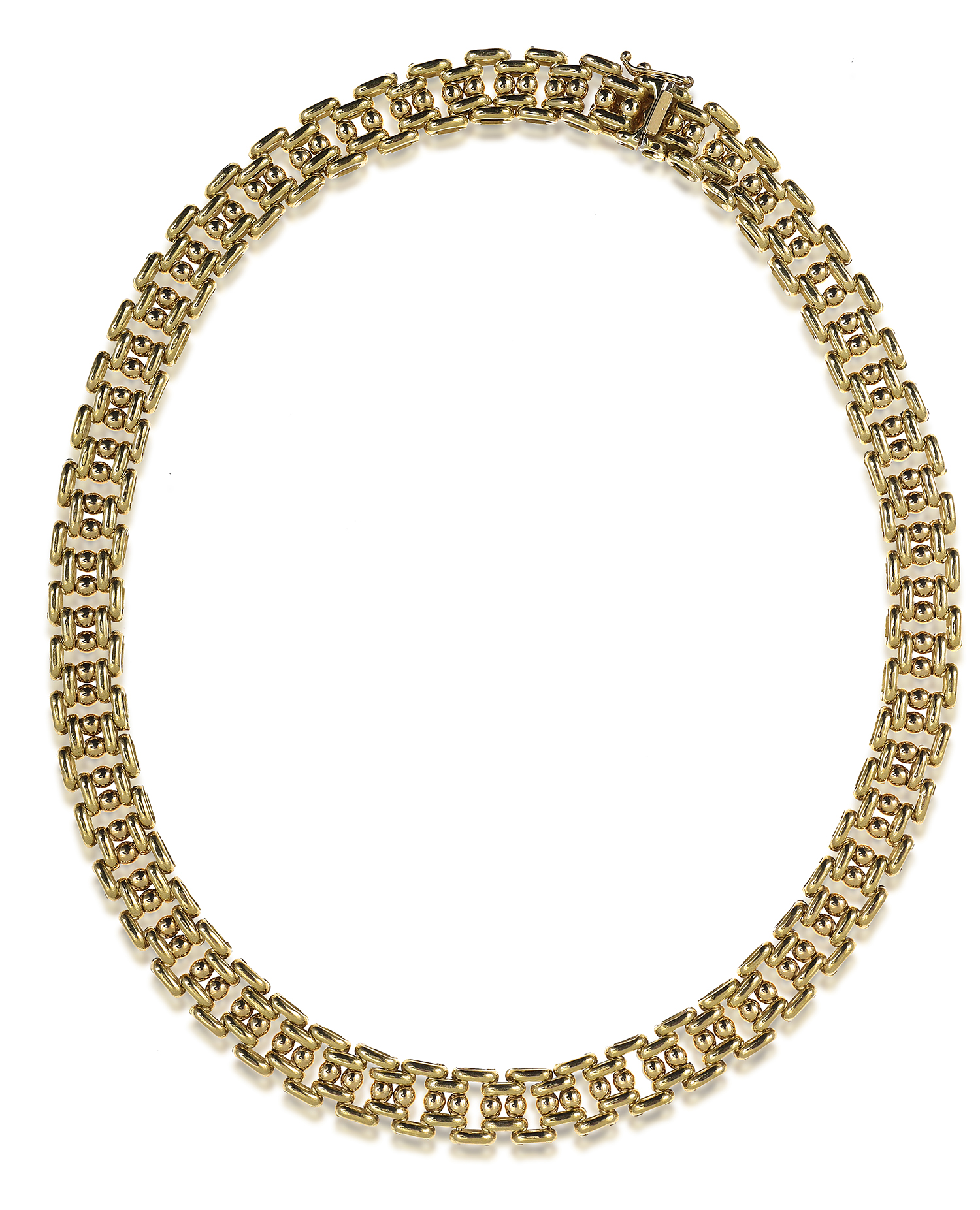 The fancy brick and bead link necklace and bracelet modelled in 18ct gold, total length 410mm.