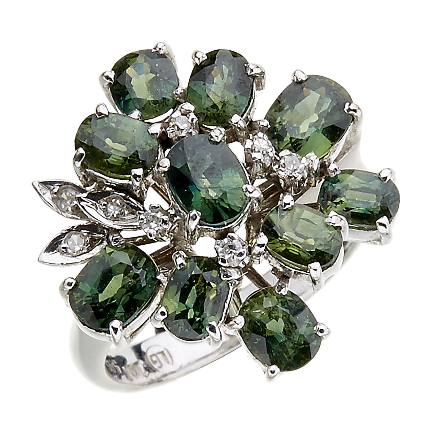 Randomly set with marquise cut green tourmaline with diamond detail mounted in 14ct white gold, ring size N.