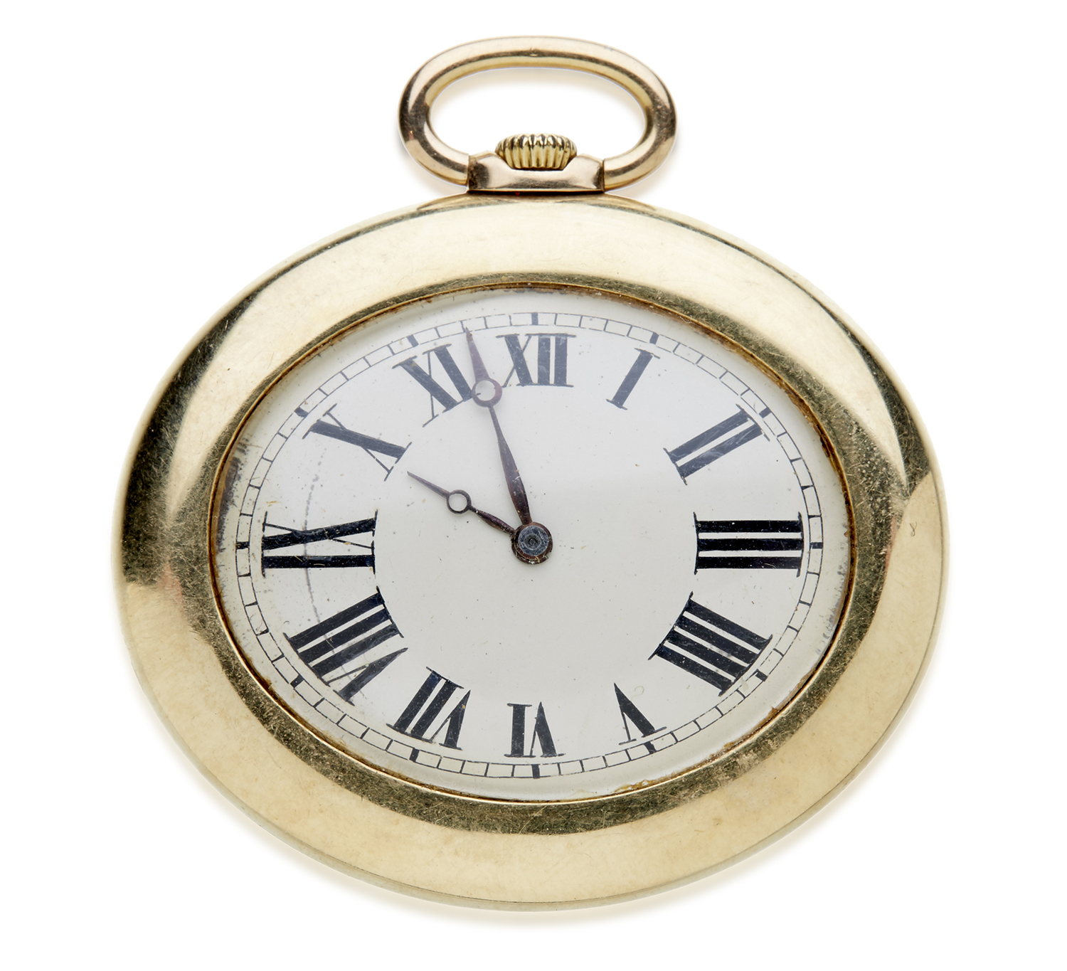 Manual wind movement, oval silvered dial with black Roman numerals, 14ct gold case, 30mm diameter.