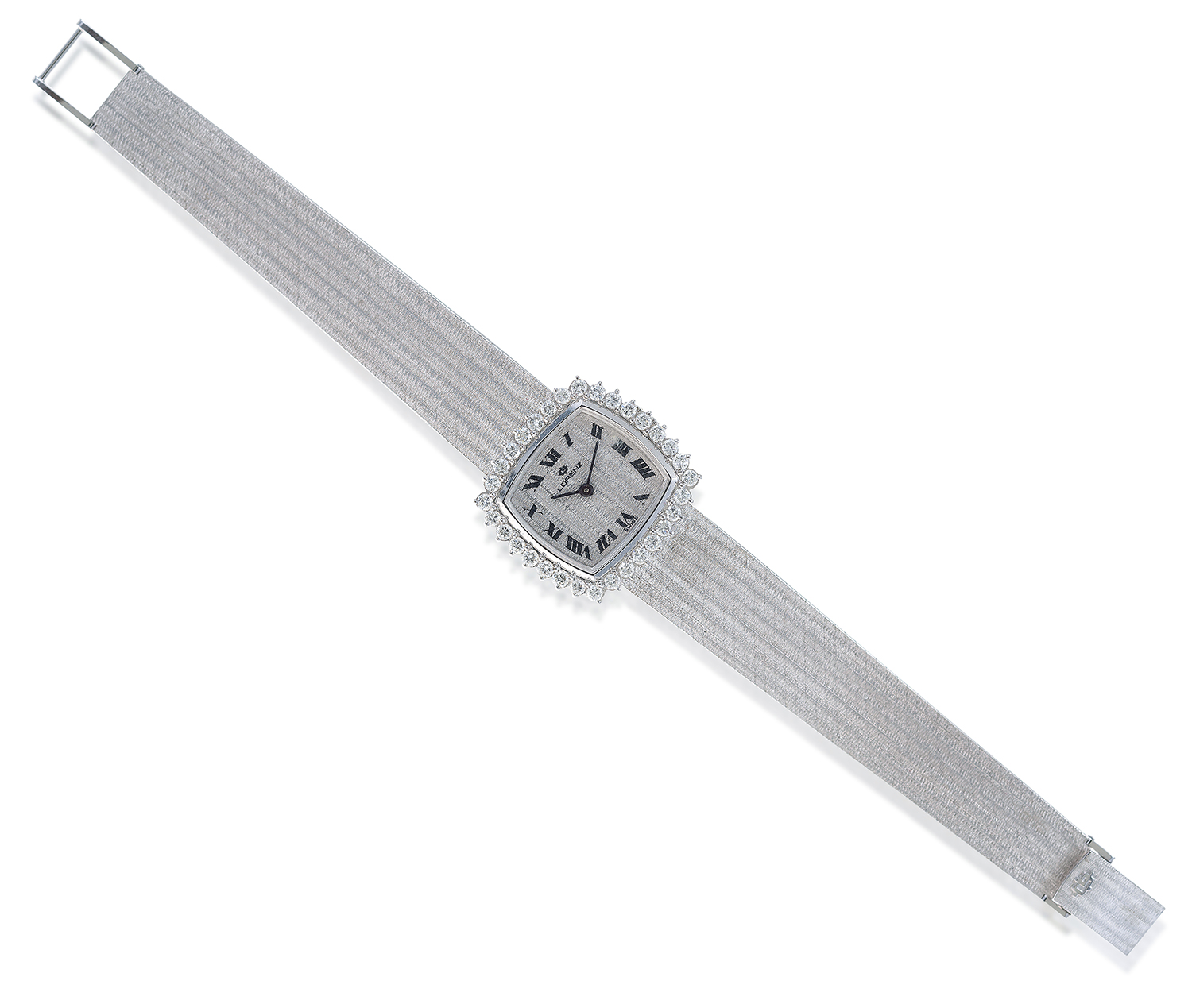 Manual wind movement, the cushion shaped silvered dial with black Roman numerals, signed case, dial and movement, having round brilliant cut diamonds set to the bezel, 18ct white gold case and integral woven bands, 23mm diameter, total length 185mm.