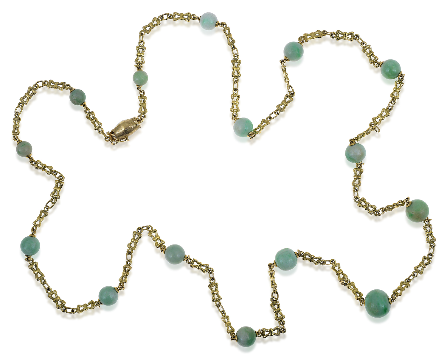 Featuring fifteen graduated polished jadeite beads interspaced by fancy link chain, all mounted in 18ct gold, total length 960mm.