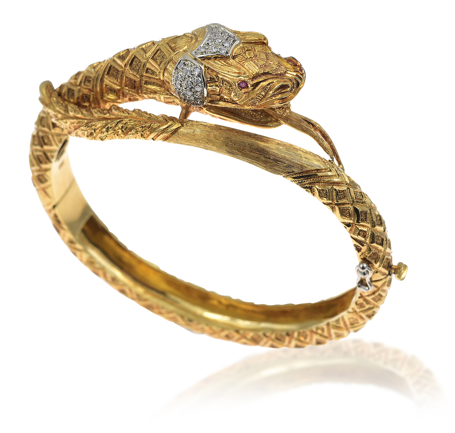 The oval hinged bangle modelled as a dragon, having engraved textured decoration and finished with a diamond and ruby set head.