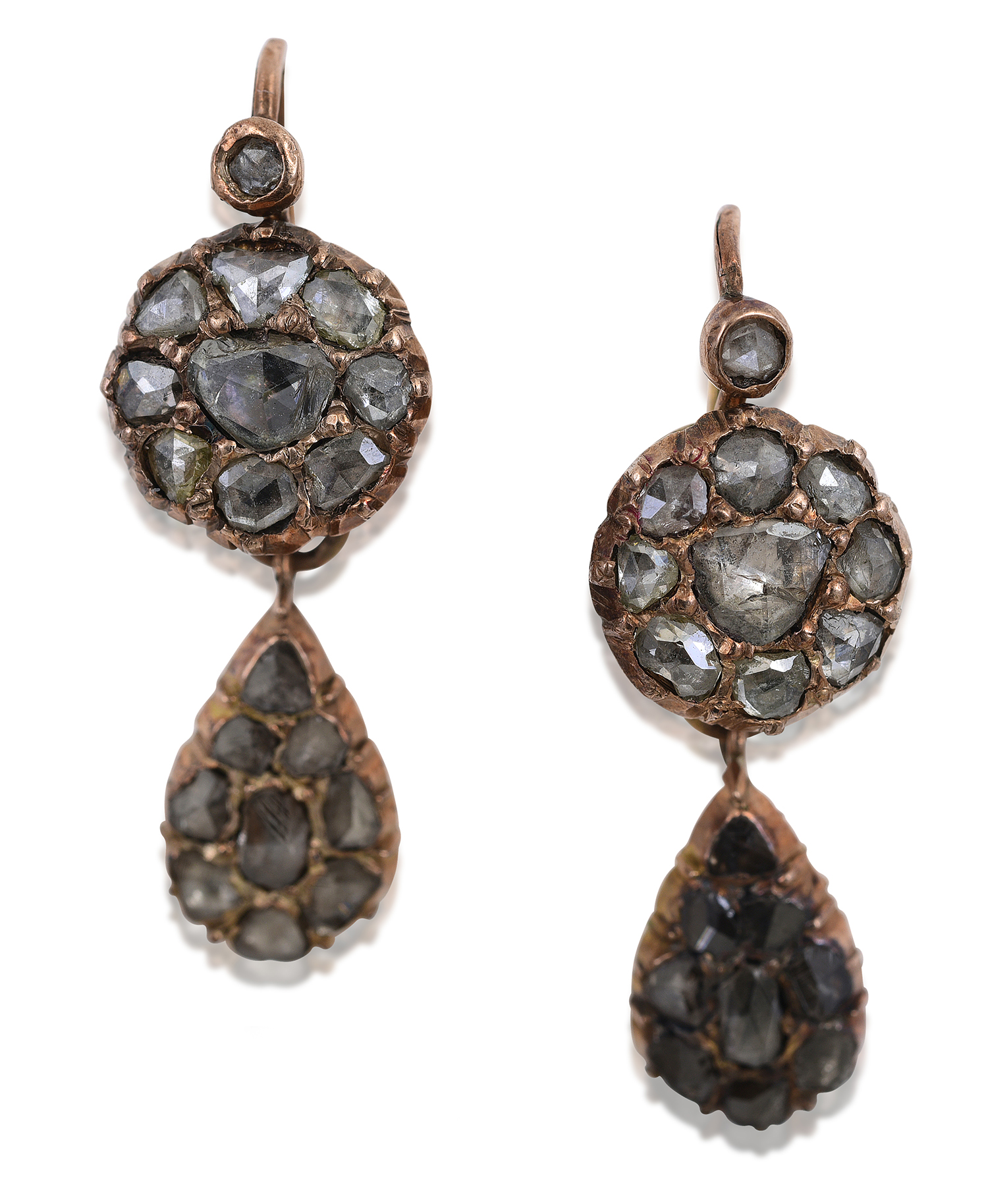 Earrings present in good condition and stones are all well matched. Stones are foiled and backed in gold. Having continental hook and clip fittings.