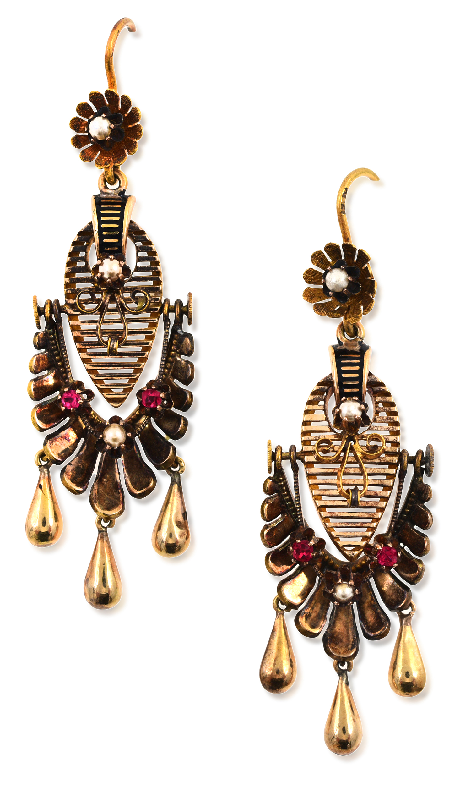 Each pierced pendeloque drop having an articulated panel with black enamel, seed pearl and stone set detail, mounted in 14ct gold, boxed.