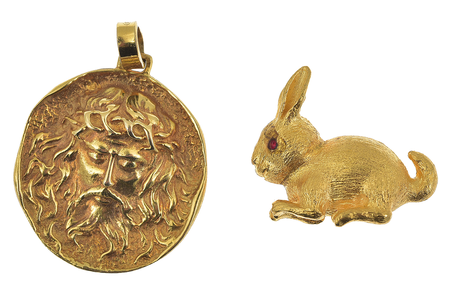 One finely modelled as a rabbit in 22ct gold, the other modelled as a mythical portrait in 18ct gold.
