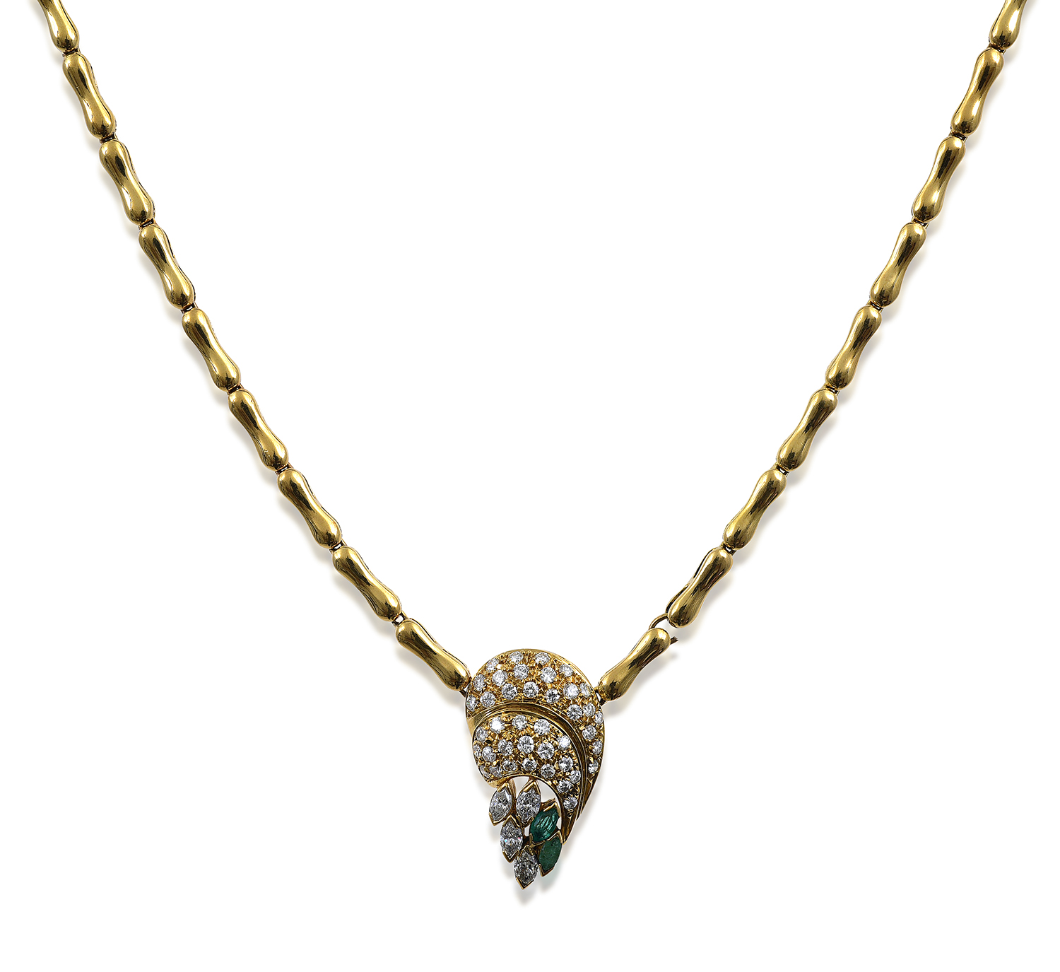 Featuring a drop pendant set with marquise and round brilliant cut diamonds and emeralds, suspended from a fancy link chain, all mounted in 18ct gold, total length 420mm.