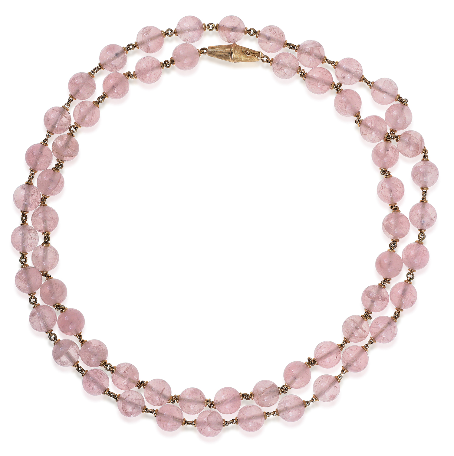 Comprising fifty nine round polished rose quartz beads measuring 5.00mm, interspaced by gold chain and finished with a barrel clasp, all mounted in 18ct gold, total length 920mm.
