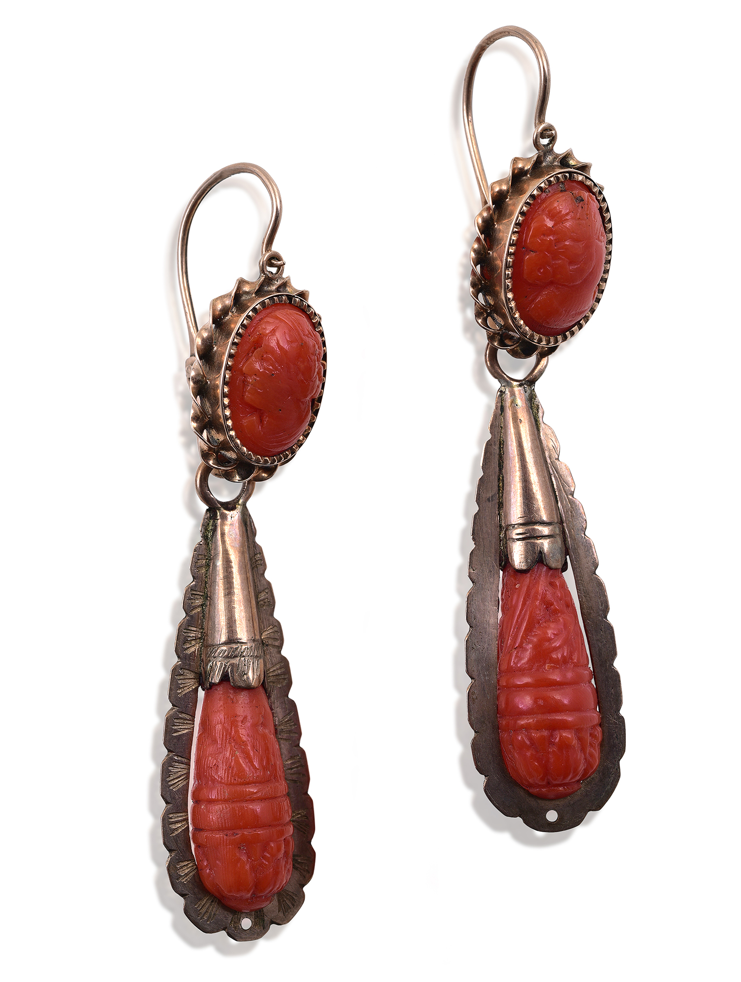 Earrings present in good condition and coral is well matched. One coral cameo has a small crazed natural section at the top measuring 0.5cm, natural inclusions and features can be seen on the back of the cameos. pendant drop frames are pierced at the bottom suggesting a further drop would have been present. Having large continental shepherd hook fittings.