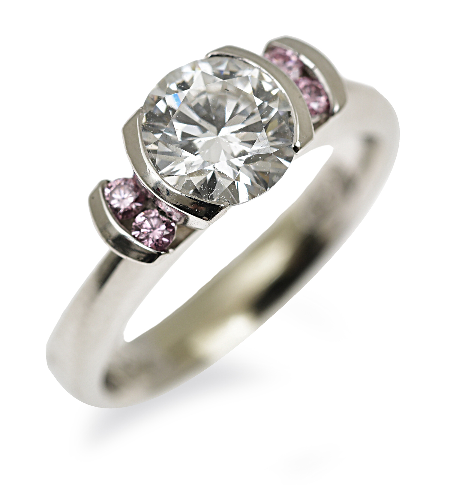 Centrally set with a round brilliant cut diamond of 0.93cts, flanked by two Argyle pink diamonds to either side totalling 0.07cts mounted in platinum, ring size G.