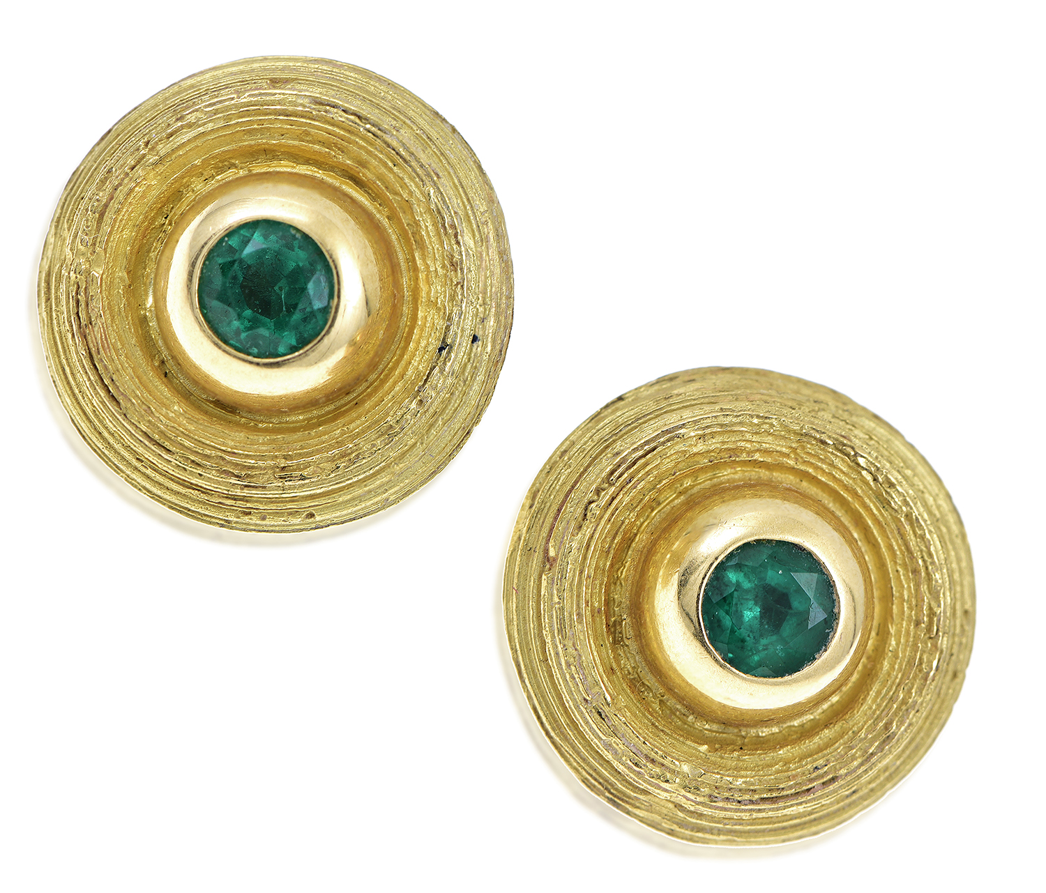 Each earring centrally set with a round brilliant cut emerald mounted in a fluted frame of 22ct gold.
