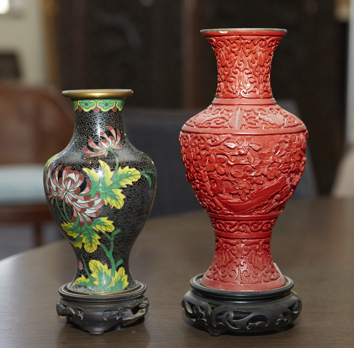 A CINNABAR VASE ON STAND AND A CLOISONNÉ VASE ON STAND
