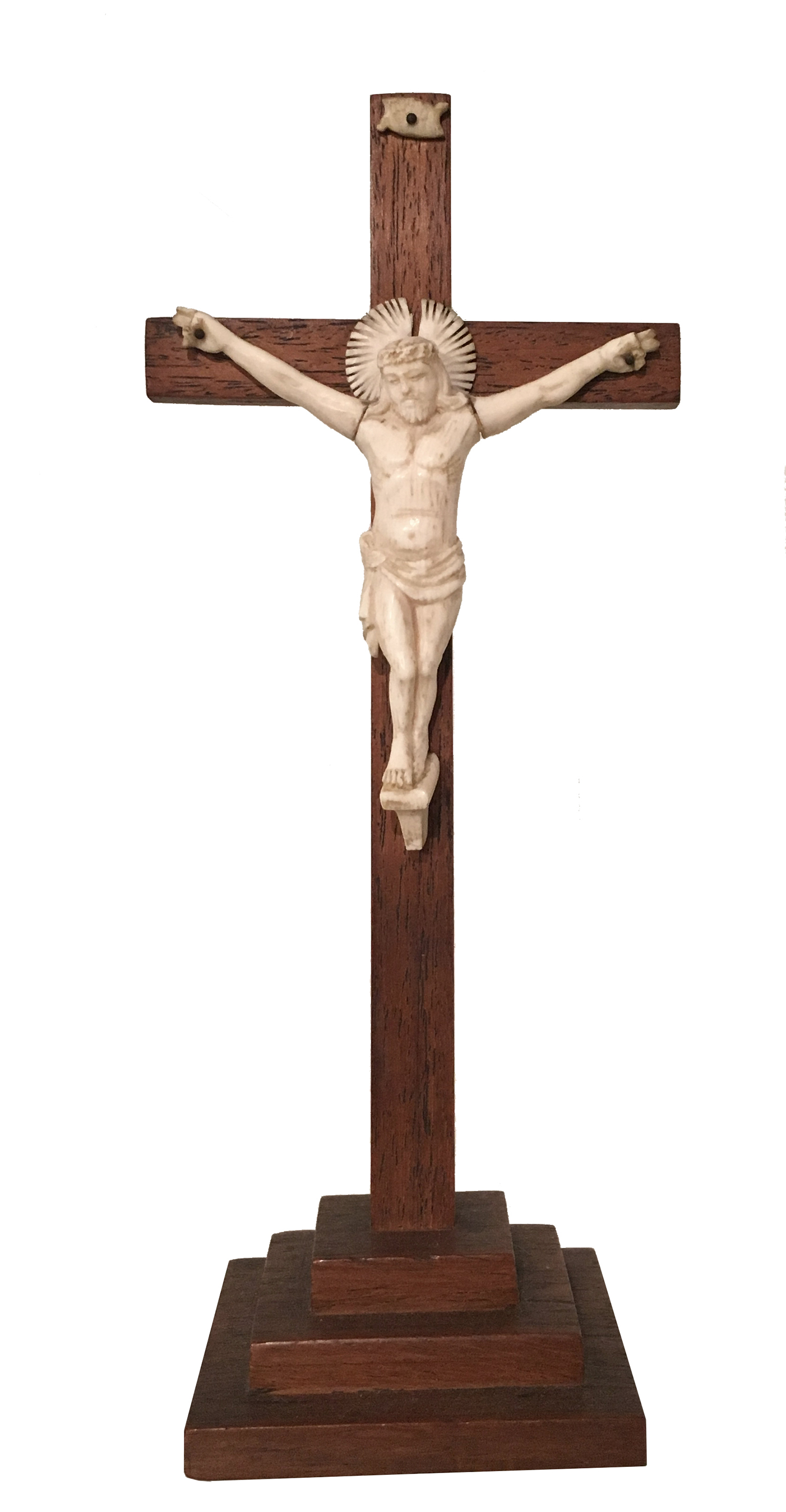 A CARVED IVORY CORPUS CHRISTI ON OAK STAND, EARLY 20TH CENTURY