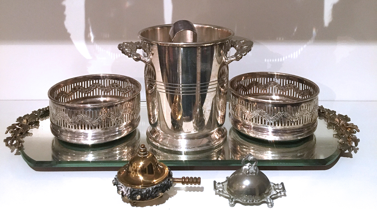 TWO SILVER PLATE COASTERS, A HARRINGTON PLATE ICE BUCKET, MINIATURE PAN AND MEAT COVER ON A GLASS TRAY