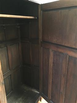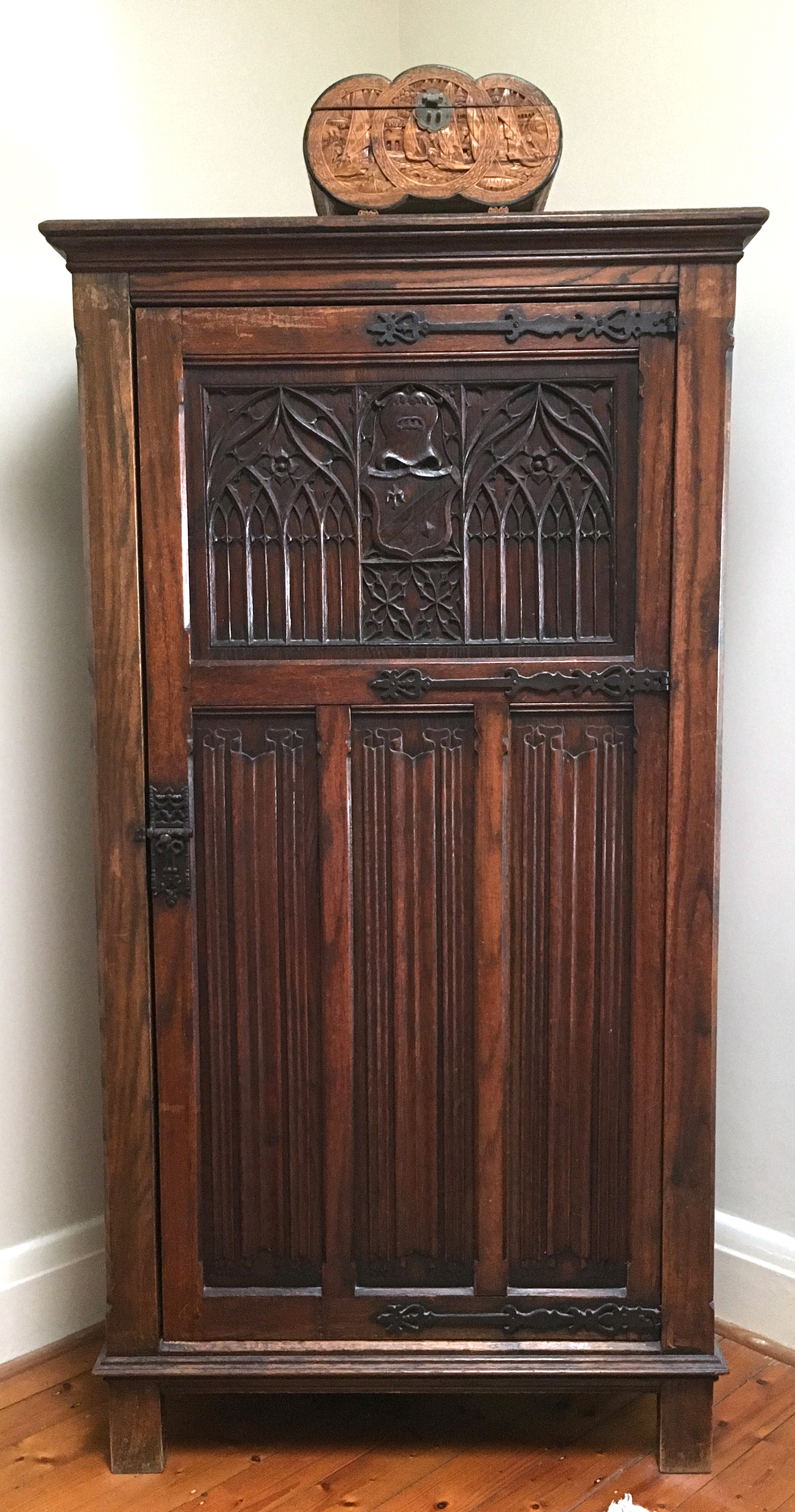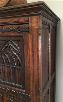 With linenfold mouldings and Gothic architrave and armorial mouldings in relief, iron fittings, the inset panelled interior with later hanging rail installed, 96 width x 52 depth x 179cm height