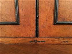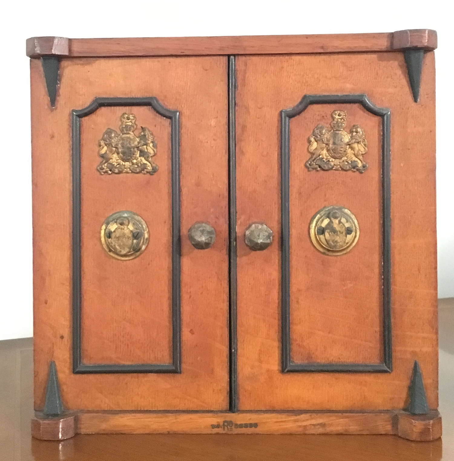 With gilded Royal crest embellished armorial and ebonised stringing and mounts opening to brass handled drawers, paper label and RD mark, 24 width x 18 depth x 24cm height