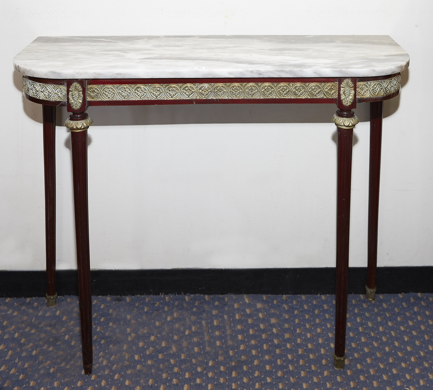 A LOUIS XVI STYLE CARRERA MARBLE TOPPED CONSOLE TABLE