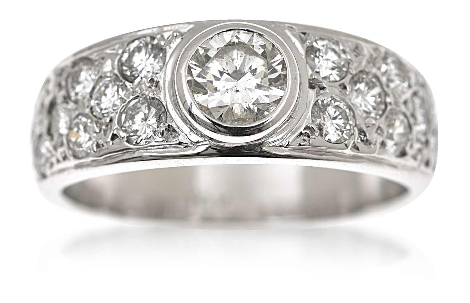 Featuring a round brilliant cut diamond of 0.46cts, surrounded by further diamond detail, mounted in 18ct white gold, ring size L-M.