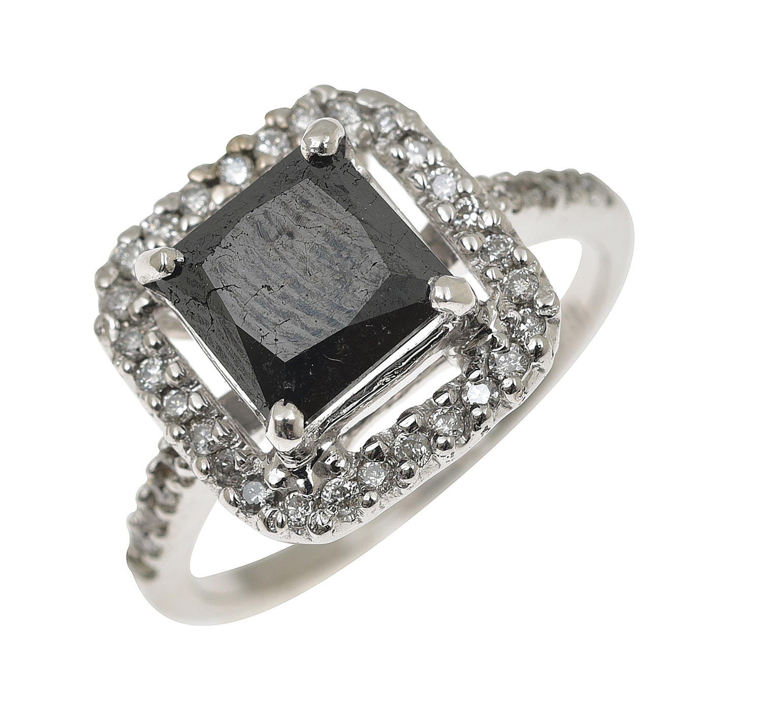 Centrally set with a square cut black diamond of 3.10cts, having round brilliant cut white diamond detail to the pierced surround and shoulders totalling 0.35cts, mounted in 18ct white gold, ring size M-N.