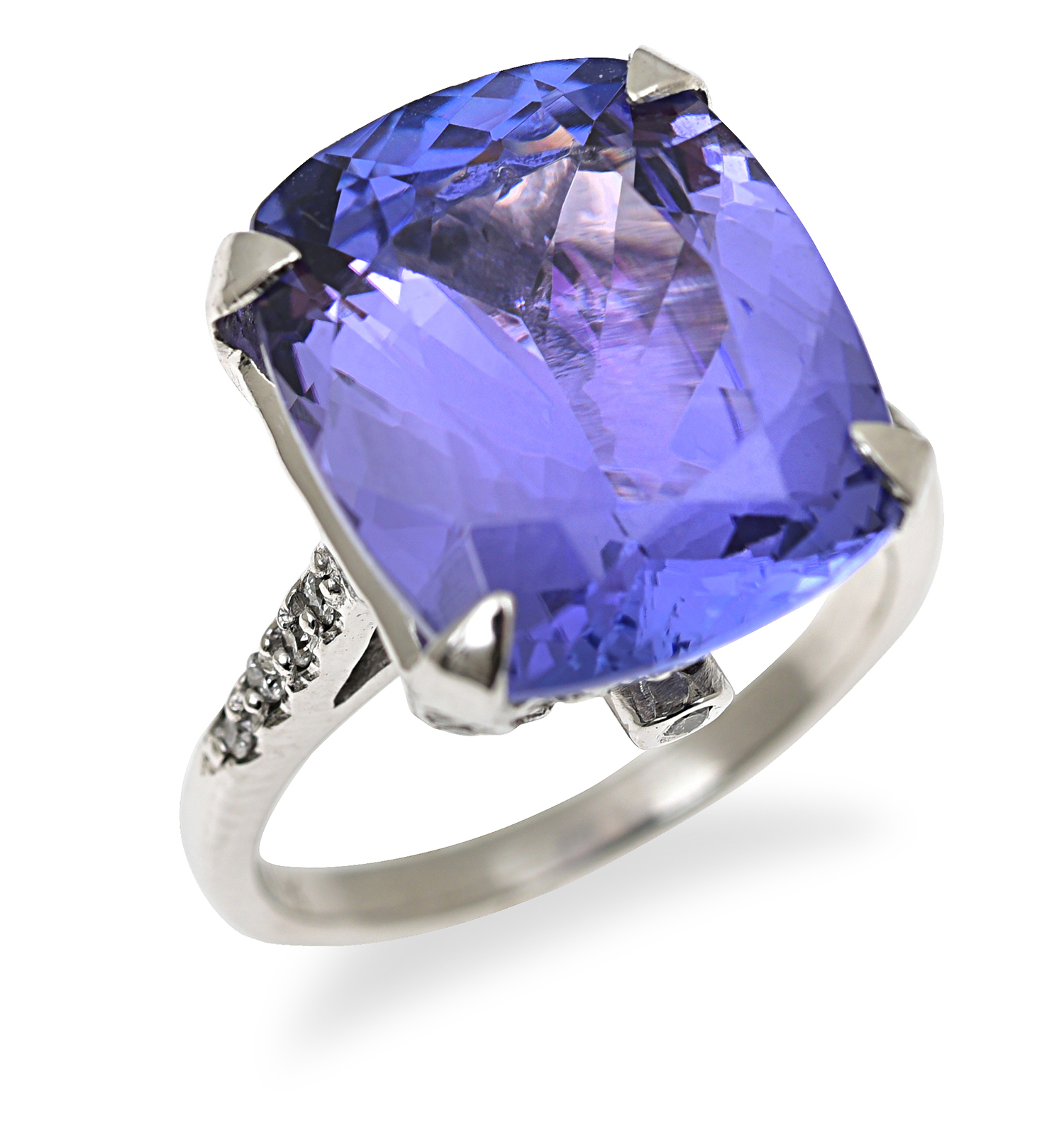 The cushion cut tanzanite of 10.00cts, having diamond detail set to the shoulders, mounted in 18ct white gold, ring size L.