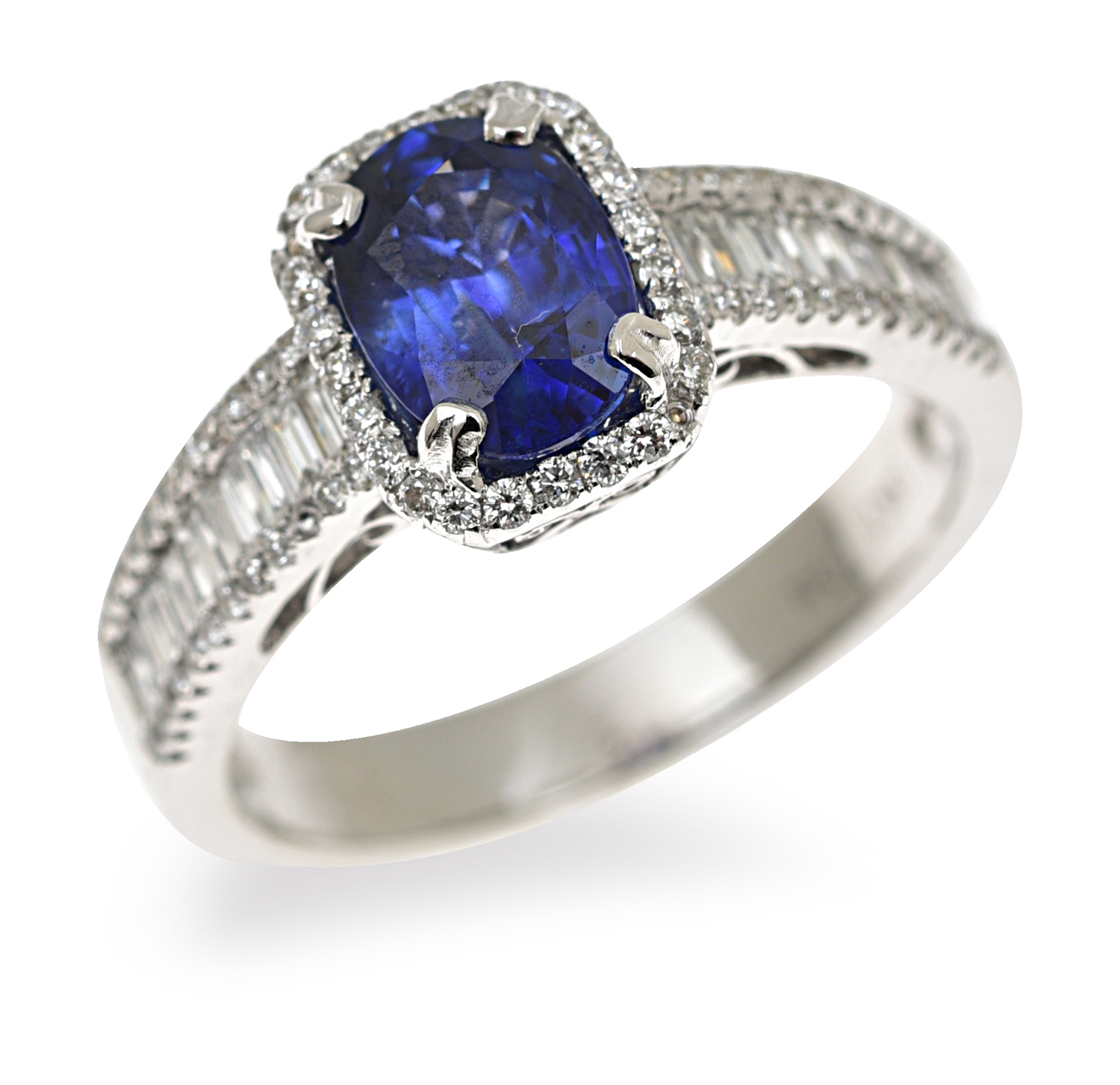 Featuring a cushion cut sapphire, having round brilliant cut diamonds set to the surround and shoulders with additional baguette cut diamonds, mounted in 18ct white gold, ring size M-N.