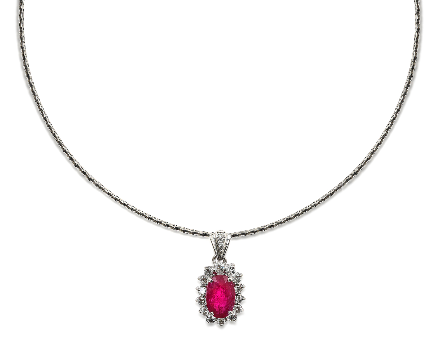 The oval cut ruby of 2.99cts surrounded round brilliant cut diamonds totalling 0.85cts, suspended from a wire collar, all mounted in 18ct white gold.