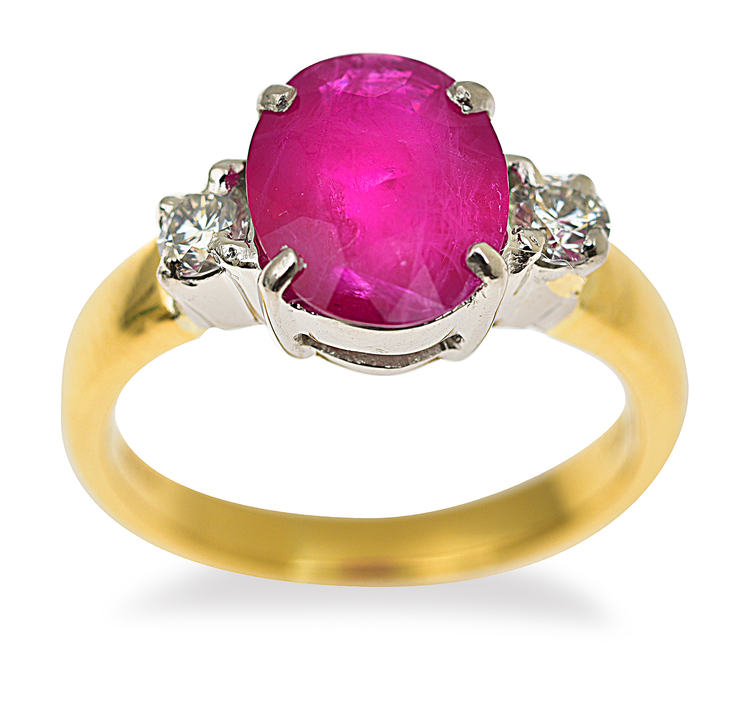 The oval cut ruby of 2.27cts, having a round brilliant cut diamond set to each shoulder, mounted in 18ct gold, ring size M.