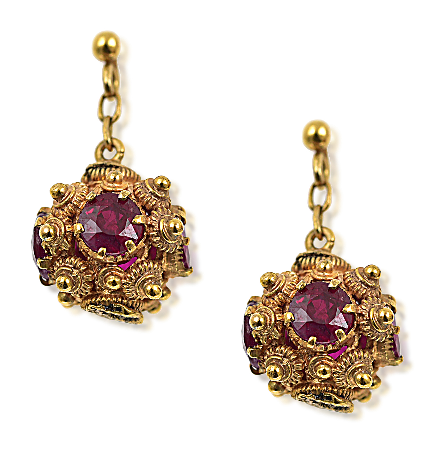 Each comprising a ball set with four round rubies set within fine cannetille work, mounted in gold.