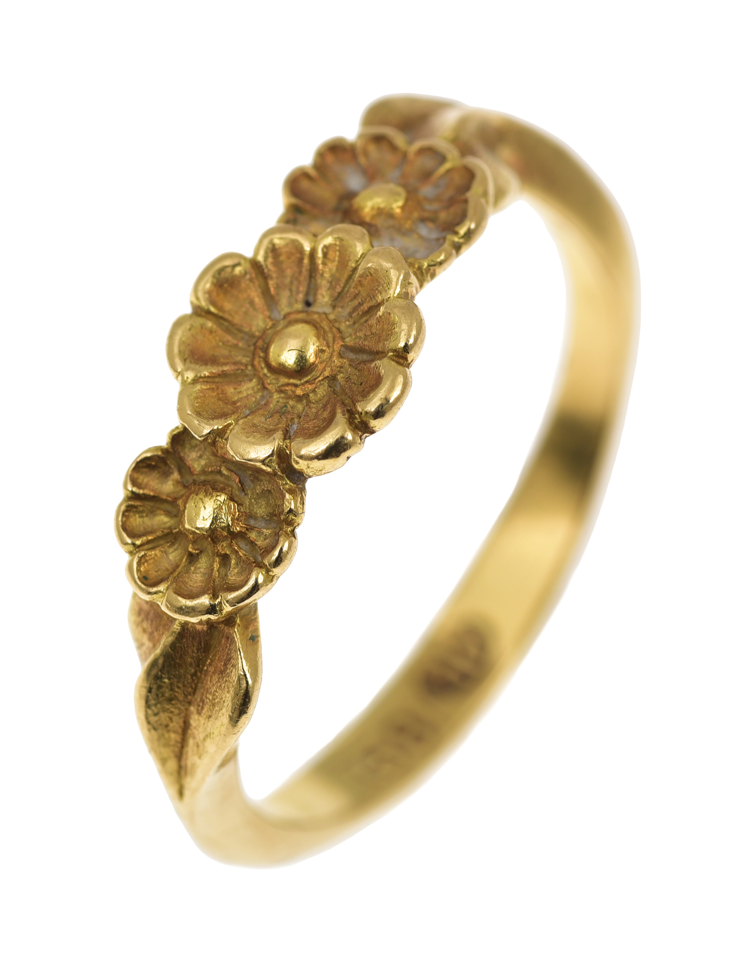 Handcrafted depicting three flowers with leaves to the shoulders, mounted in 18ct gold, ring size M-N.