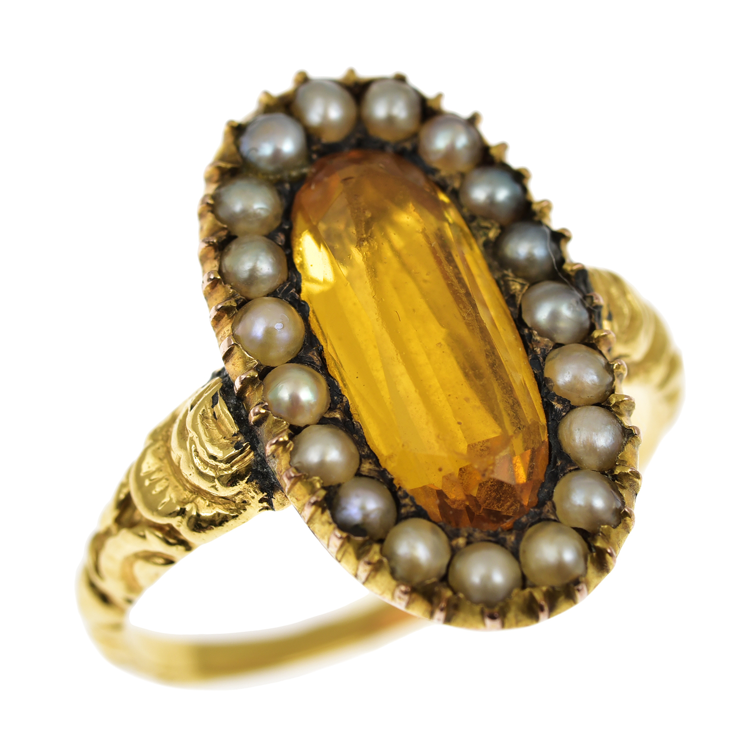 The oval cut foil backed citrine surrounded by seed pearls, mounted in 15ct gold, ring size J.