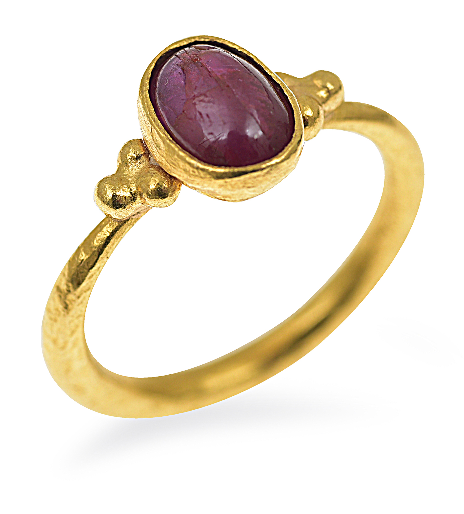 The oval ruby cut en cabochon, mounted in a finely beaten frame and band of 22ct gold, ring size I-J.
