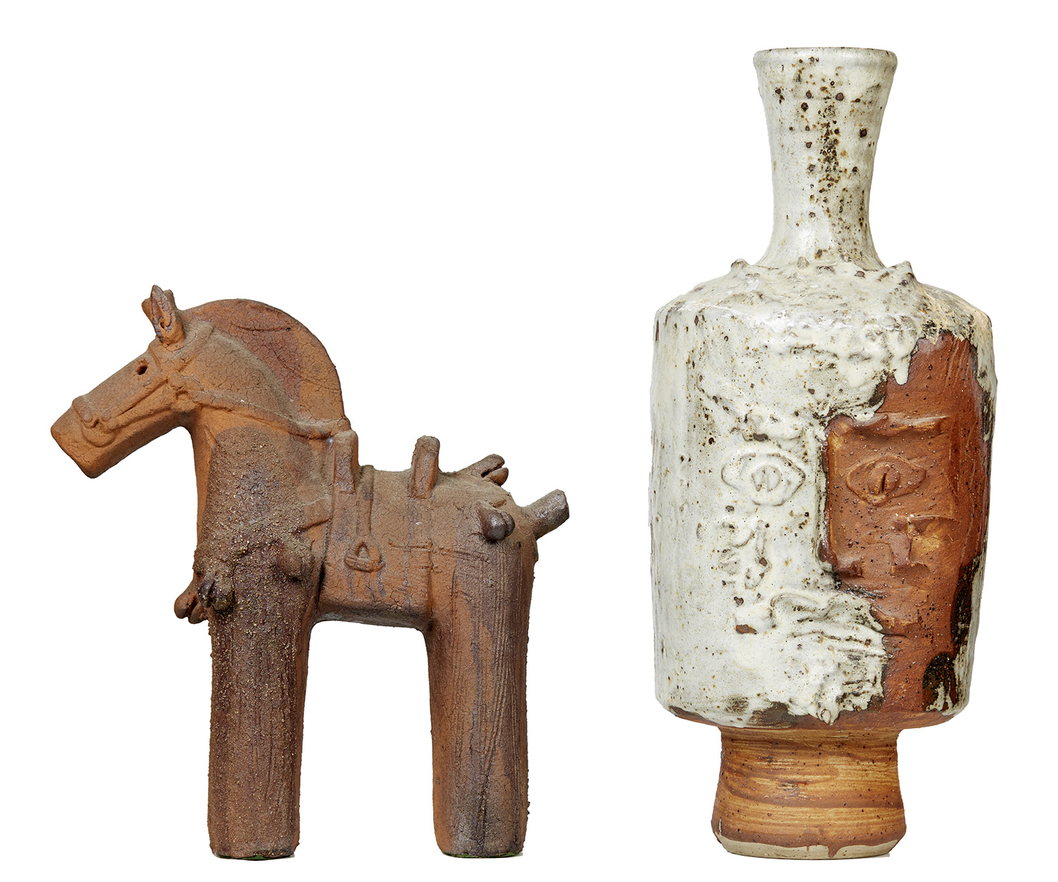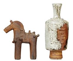 Comprising a sculptural 'face' vase with seal mark and stylised horse figure, unmarked