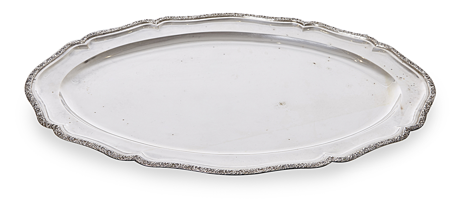 Of shaped ovular form with feather scroll and floral repousse rim, hallmarked and with makers stamp rubbed, 62.5cm width and 1949 grams