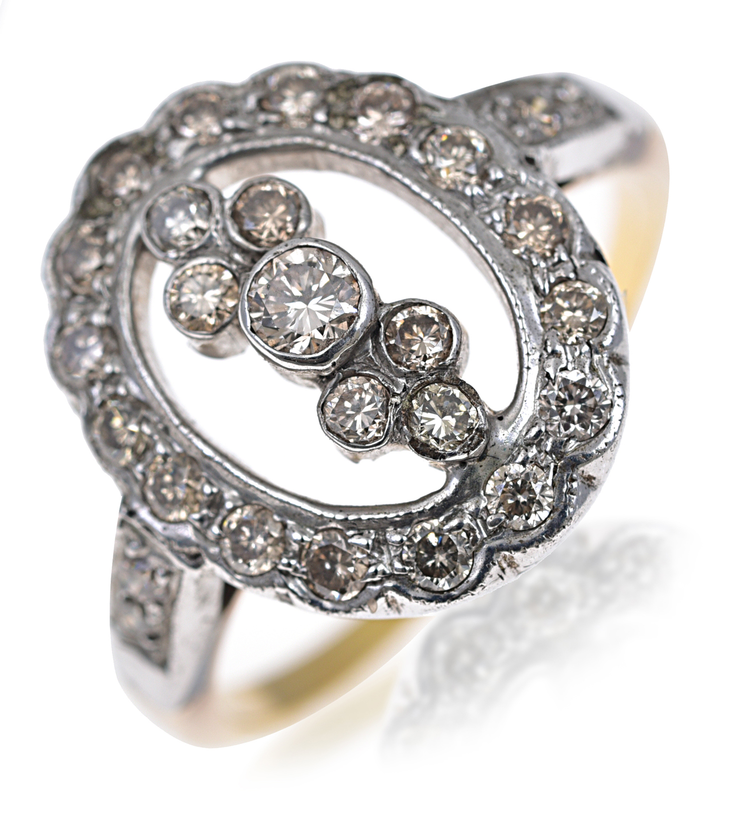 Ring presents in fair condition. Diamonds total 0.50cts. Shank is worn.
