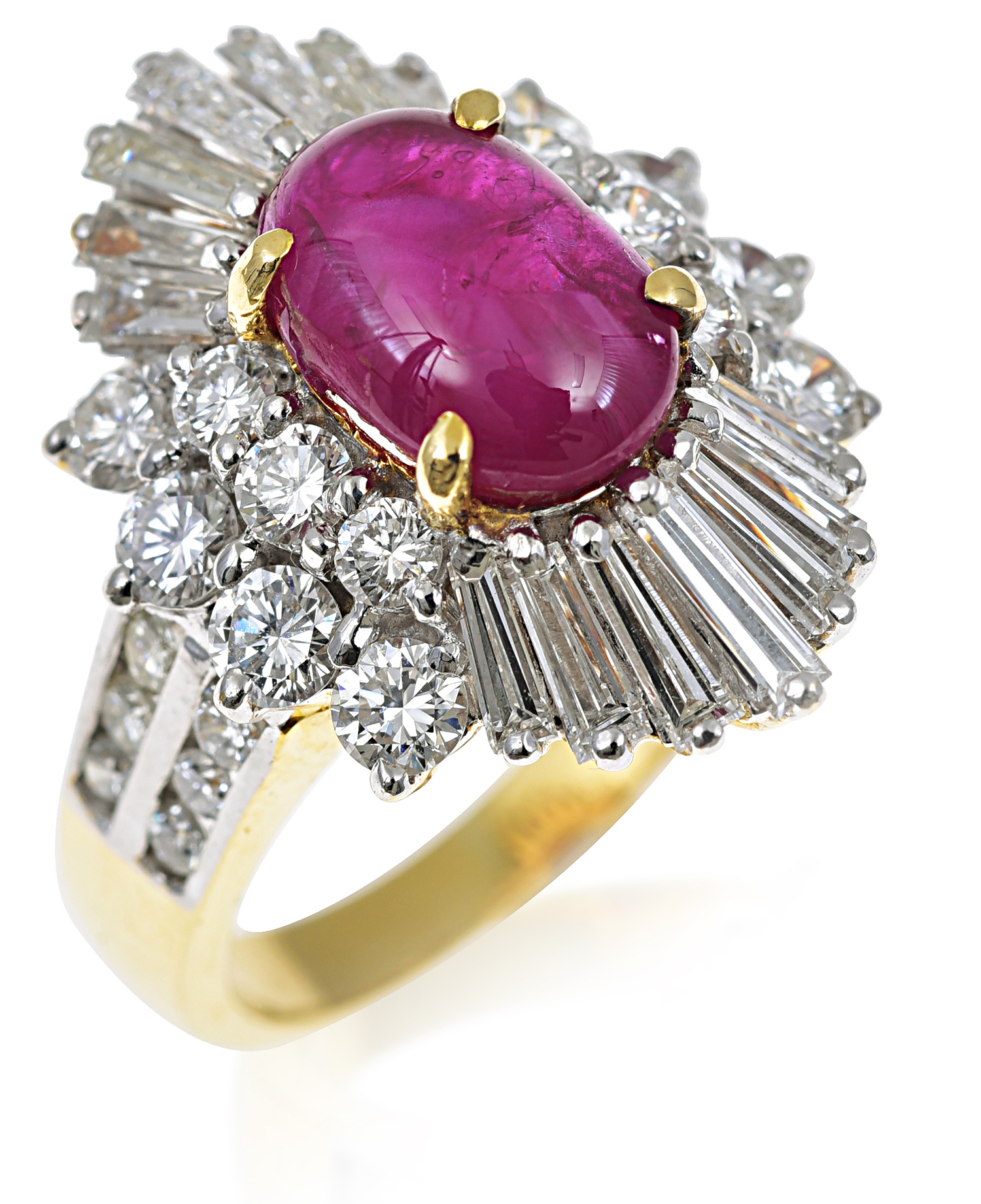 The oval ruby cut en cabochon surrounded by tapered baguette and round brilliant cut diamonds, mounted in 18ct gold, ring size J.