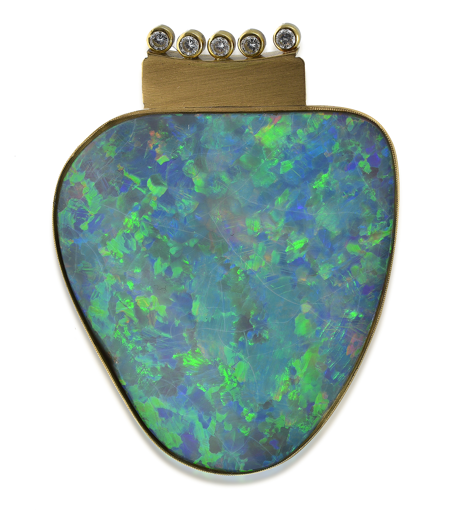 The large solid free form opal cut en cabochon surmounted by a row of five round brilliant cut diamonds, mounted in 18ct gold.