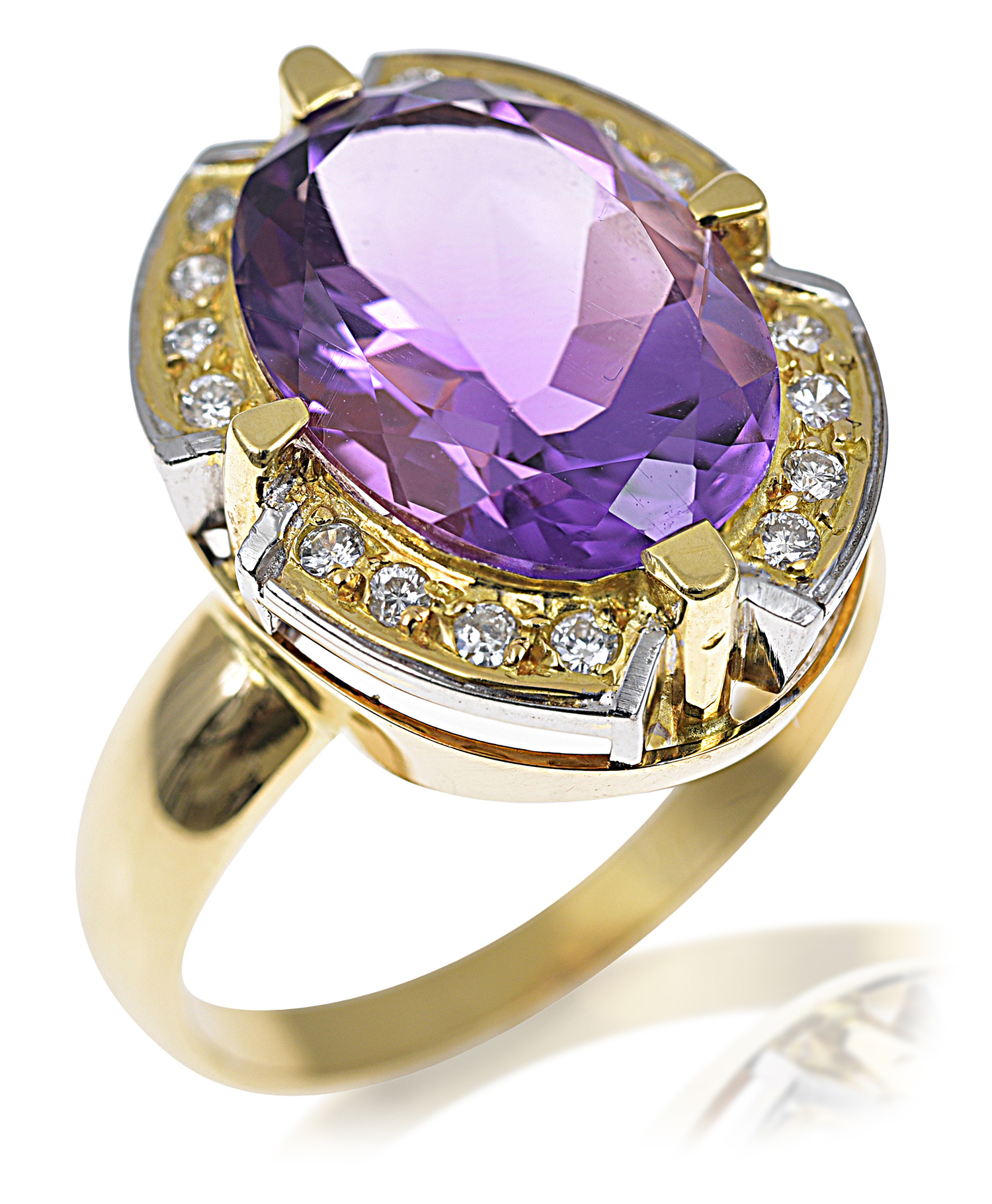 The oval cut amethyst of 5.25cts having diamond detail set to the surround, mounted in 18ct gold, ring size P-Q.