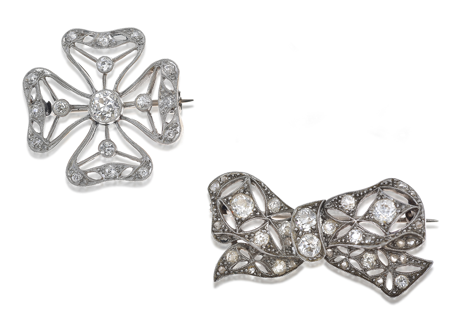 One modelled as a pierced four leaf clover the other a pierced bow, both set with early round brilliant and old European cut diamonds, the clover mounted in platinum and the bow in 18ct white gold.