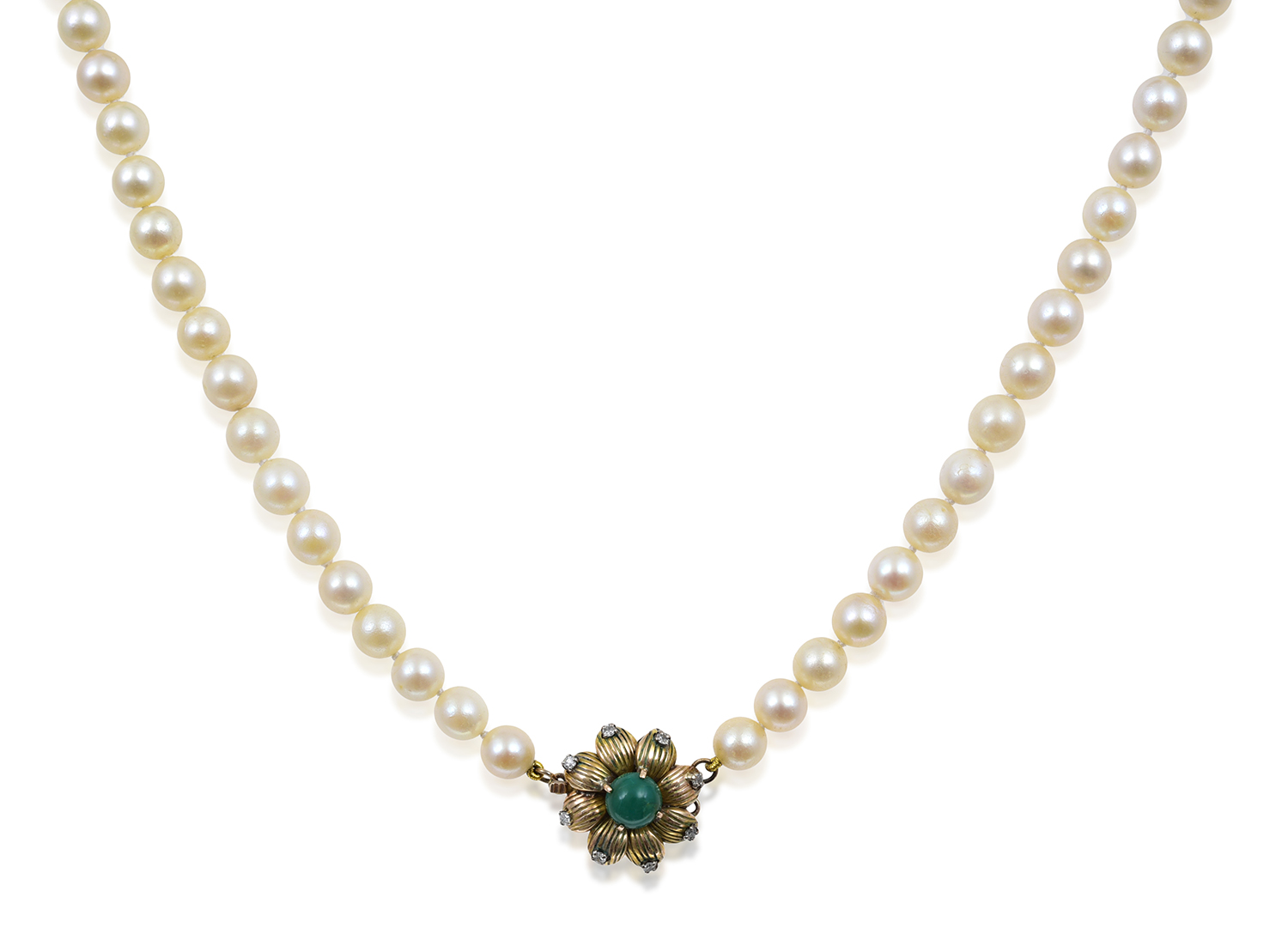 The uniform round pearls of cream hue measuring 7.5mm, to a flower cluster clasp set with diamonds and chrysoprase, mounted in 14ct gold, total length 795mm.