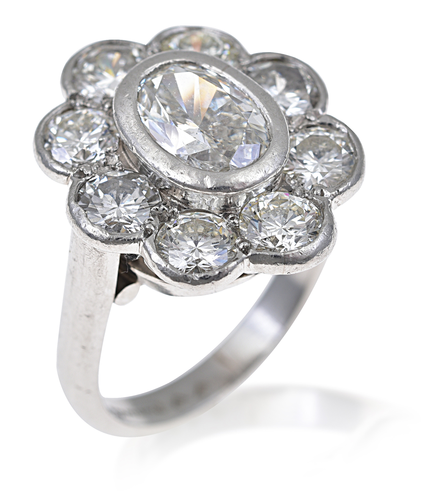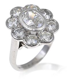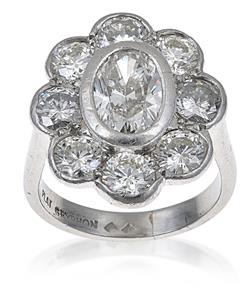 Centrally set with an oval cut diamond of 2.02cts, surrounded by eight round brilliant cut diamonds totalling 3.60cts, mounted in platinum, ring size N.