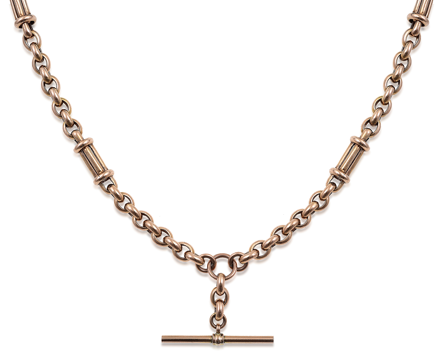 The fancy fetter link fob chain, having a t-bar and two swivel clips, mounted in rose gold, total length 590mm.