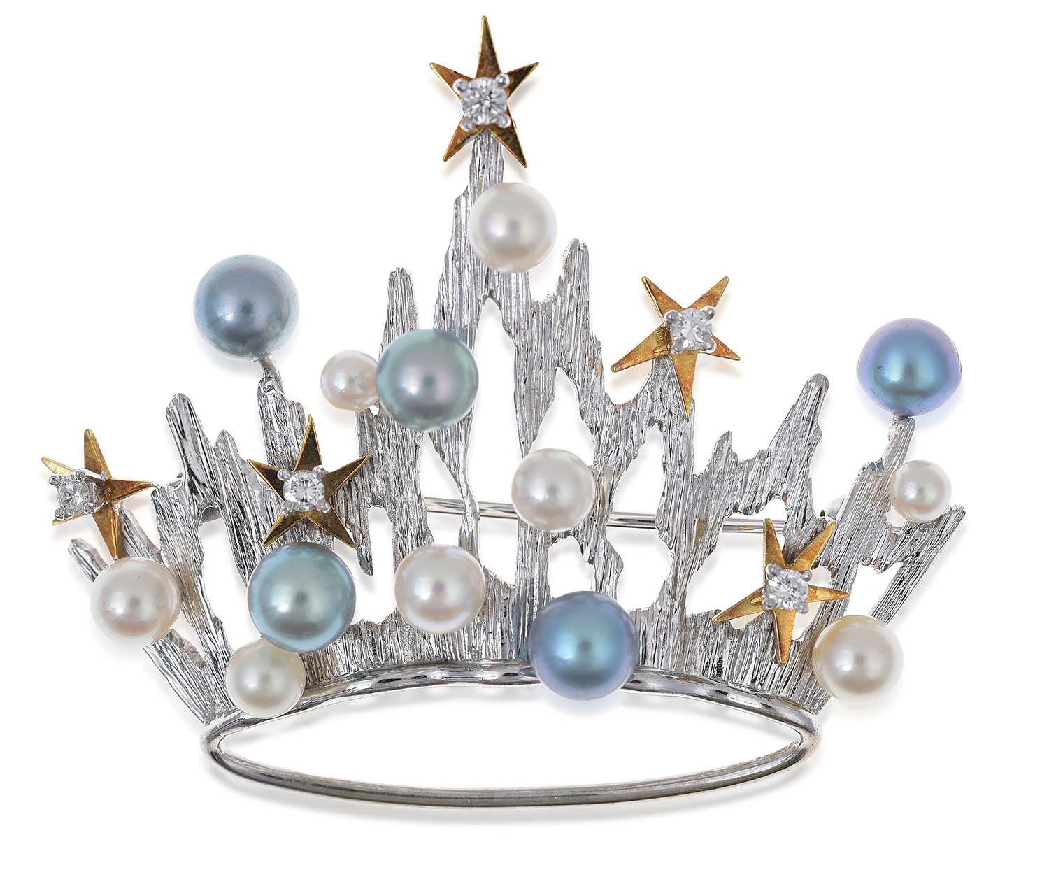 Modelled as a crown, set throughout with round cultured pearls of white and grey hues measuring 3.5mm to 6.1mm, offset with round brilliant cut diamonds, mounted in platinum and gold.