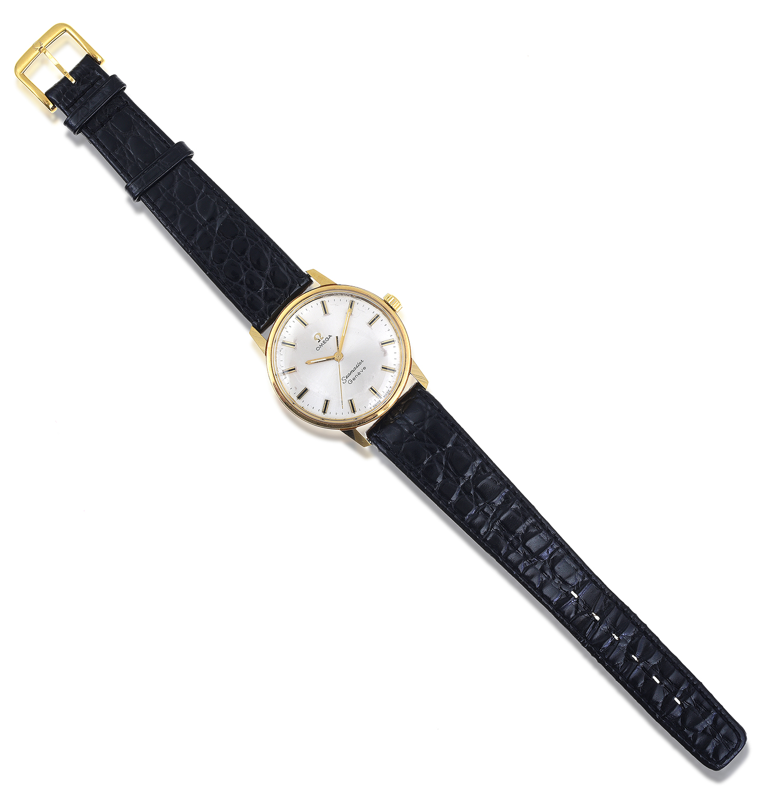 Automatic movement, the circular cream dial with applied baton numerals, signed case, dial and movement, calibre 552, case reference 165002, gold capped case and original black leather bands, 34mm diameter.