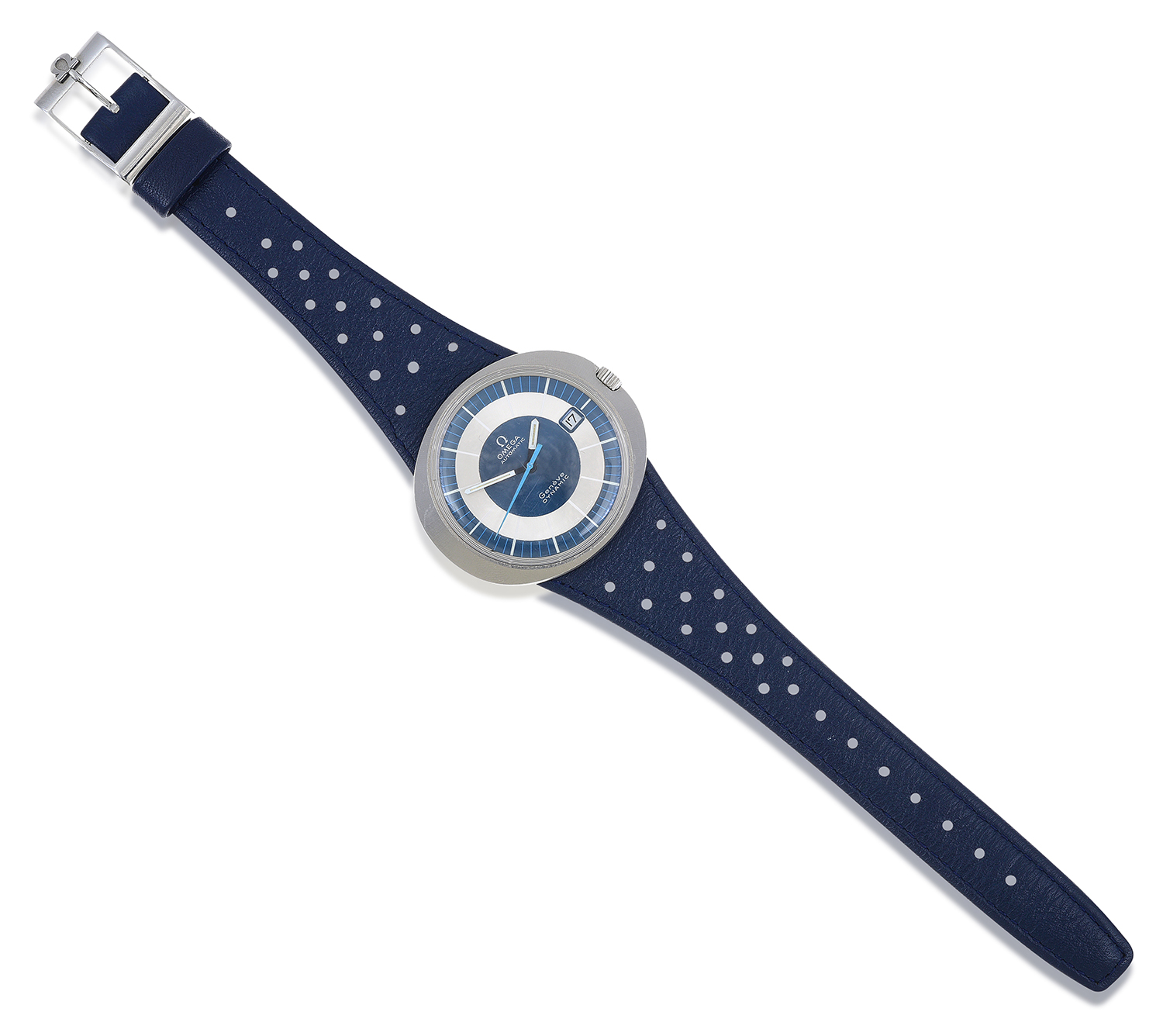 Automatic movement, circular silver and blue dial with baton numerals and date at three, signed case, dial and movement, stainless steel elipictal case and original pierced blue leather bands, 40mm diameter.