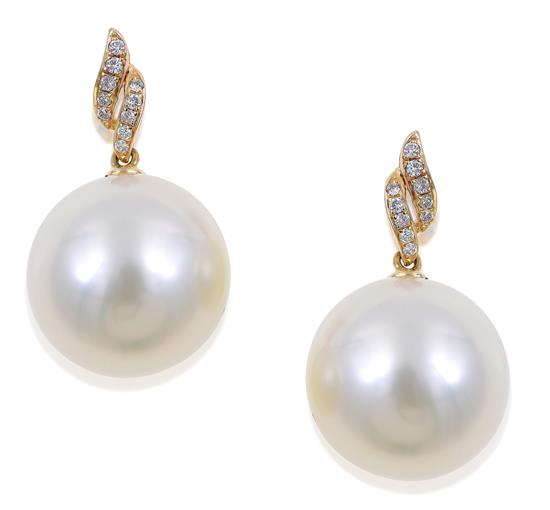 Each earring featuring a round pearl of cream and white hues measuring 14.50mm, suspended from a diamond set panel, mounted in 18ct gold.