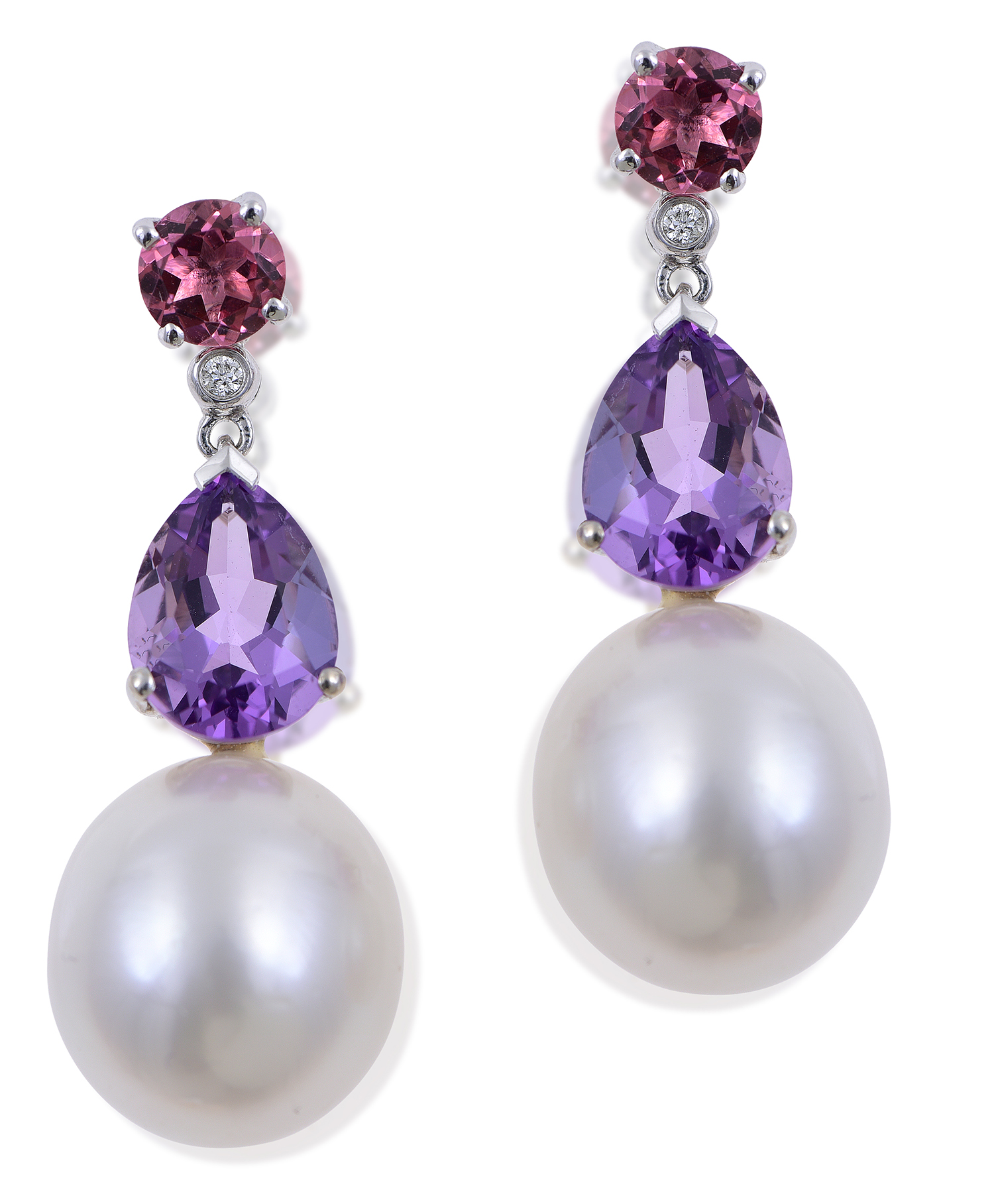 Each earring featuring a baroque pearl of silver and white hues measuring 11.80mm, surmounted by amethyst, diamond and pink tourmaline, all set in 14ct white gold.